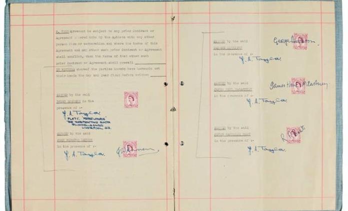 El documento, presentado este viernes a la prensa, está escrito a máquina, con fecha del 24 de enero de 1962, e incluye las rúbricas de John Lennon, Paul McCartney, George Harrison y el baterista original del grupo, Pete Best.