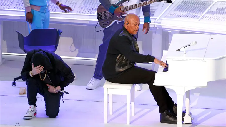 El espectáculo de 2022 presentó una celebración del hip hop con astros del género como Dr. Dre, Snoop Dogg, Mary J. Blige, 50 Cent, Eminem y Kendrick Lamar. Pero al concluir la actuación de Eminem de "Lose Yourself", el rapero se arrodilló dramáticamente, bajando la cabeza en un gesto ampliamente interpretado como un tributo a Colin Kaepernick, cuya decisión de arrodillarse durante el himno nacional en 2016 para protestar contra la brutalidad policial provocó un ajuste de cuentas cultural a nivel nacional. La protesta de Kaepernick fue luego eco de otros jugadores, y pronto se encontraría fuera de la liga.