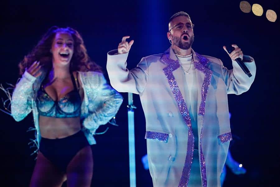 Por si acaso la presencia de Maluma, las bailarinas y las lenguas de fuego no fueran suficiente, se han sumado rápidamente a la fiesta infinidad de proyecciones, algunas sobre las enormes pantallas situadas sobre el escenario y otras en el mismo suelo que pisaba el ídolo.