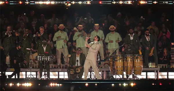 Acompañado de toda una orquesta salsera y de Los Pleneros de la Cresta, su presentación sirvió como preámbulo para su show en el Super Bowl de 2026.