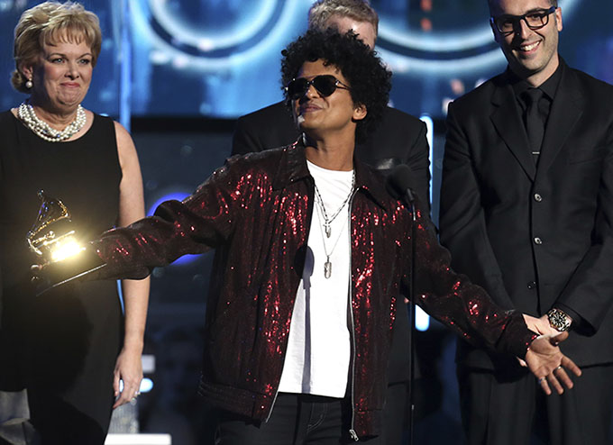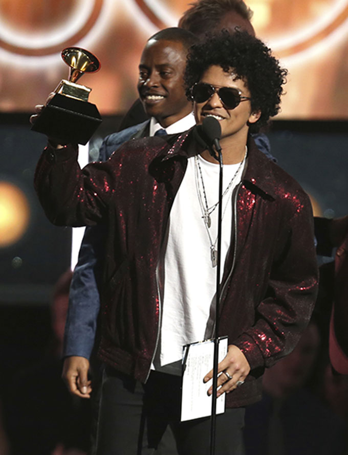 "Ay Dios mío. Muchísimas gracias chicos. Guao", dijo Mars en el Madison Square Garden en Nueva York. "Me gustaría dedicarle este premio a (compositores como Babyface, Teddy Riley Jimmy Jam y Terry Lewis)".