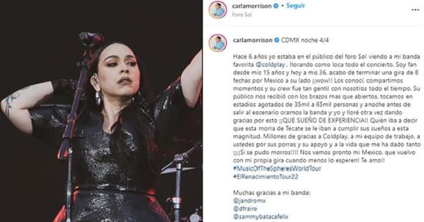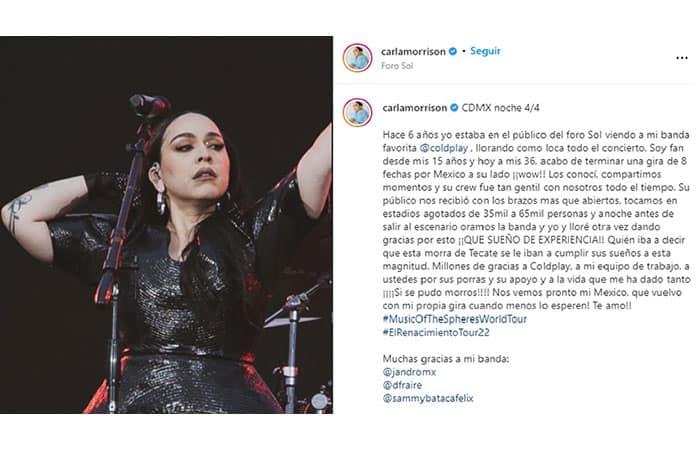 "Hace 6 años yo estaba en el público del Foro Sol viendo a mi banda favorita @coldplay , llorando como loca todo el concierto. Soy fan desde mis 15 años y hoy a mis 36, acabo de terminar una gira de 8 fechas por México a su lado ¡¡wow!! Los conocí, compartimos momentos y su crew fue tan gentil con nosotros todo el tiempo. Su público nos recibió con los brazos mas que abiertos, tocamos en estadios agotados de 35 mil a 65 mil personas y anoche antes de salir al escenario oramos la banda y yo y lloré otra vez dando gracias por esto ¡¡QUE SUEÑO DE EXPERIENCIA!! Quién iba a decir que esta morra de Tecate se le iban a cumplir sus sueños a esta magnitud. Millones de gracias a Coldplay, a mi equipo de trabajo, a ustedes por sus porras y su apoyo y a la vida que me ha dado tanto ¡¡¡¡Si se pudo morros!!!! Nos vemos pronto mi Mexico, que vuelvo con mi propia gira cuando menos lo esperen! Te amo!! #MusicOfTheSpheresWorldTour