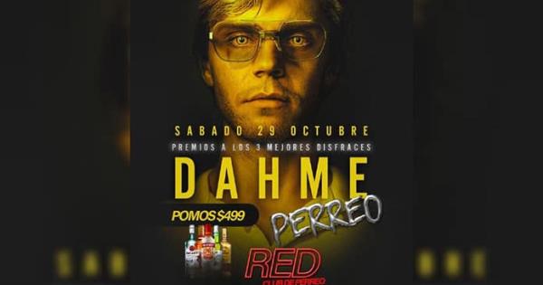 Bajo el lema “Dahme Perrero”, este antro de la capital invita a su fiesta de disfraces, por lo que los comentarios en redes de desaprobación no se hicieron esperar “¿a quién se le ocurrió esto?”, “deberían de respetar a las víctimas”, “no romanticen a un asesino serial”.