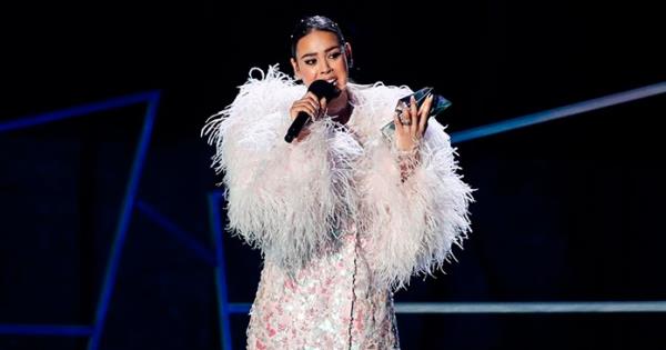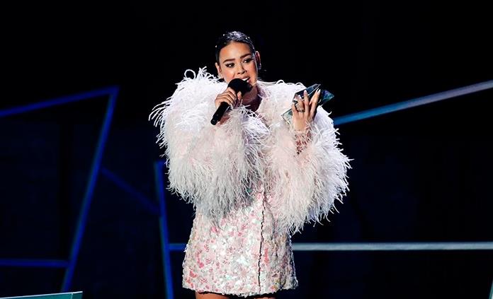 Más tarde la intérprete de "Mala fama" compartió a través de sus redes sociales lo contenta que se sentía al haber sido galardonada y con el éxito que ha tenido en los últimos meses, esta vez lo hizo con un hermoso traje tornasol verde y violeta con accesorios de la firma de joyería Bvlgari.