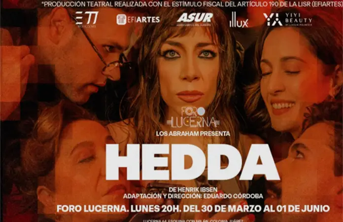 Hedda, realizada con el apoyo de Efiartes, se presenta del 30 de marzo al 1 de junio en el Foro Lucerna. Actúan Angélica Bauter, Abraham Lombrozo, Alonso Íñiguez, Ernesto M. Agraz, José Ramón Berganza, Alexis de Anda y Pilar Flores del Valle.