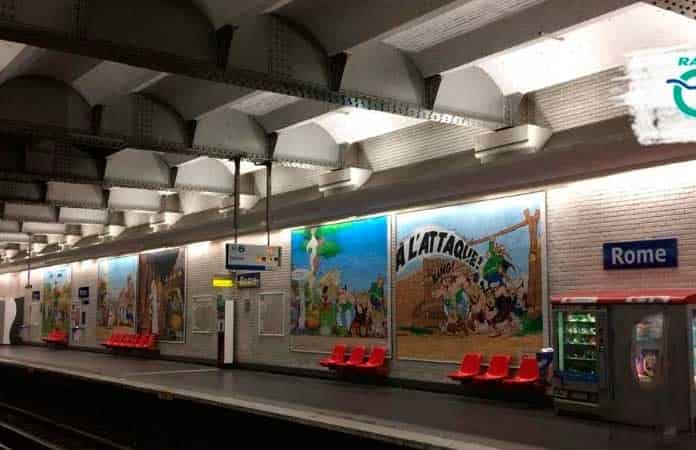 La parada "Rome", bautizada como "Están locos estos romanos", ha cambiado por completo su aspecto y en el lugar de los anuncios publicitarios ahora hay viñetas del popular tebeo, creado en 1959 por René Goscinny y Albert Uderzo.