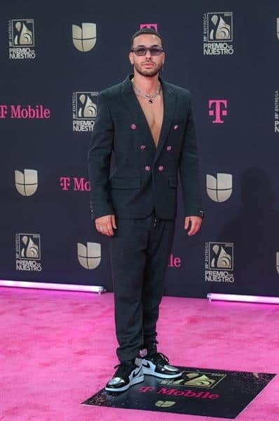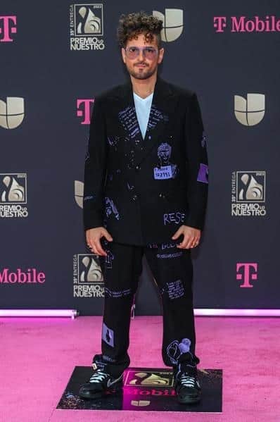 Omar Montes se estrenó en su primera alfombra roja en el continente americano con una chaqueta blanca de smoking y una camisa formal abierta, que dejaba ver un gran colgante de brillantes con su nombre.