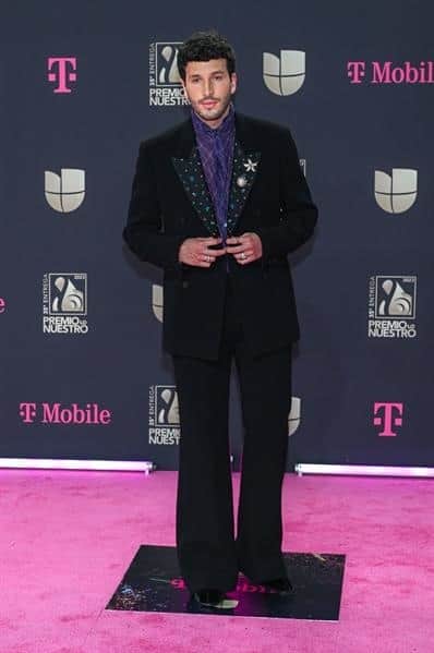 El hombre de la noche, Sebastián Yatra, que esta nominado en 10 categorías y tiene la responsabilidad de conducir el evento, impactó con su glamour al llegar con un smoking negro acompañado de una desenfadada camisa morada.