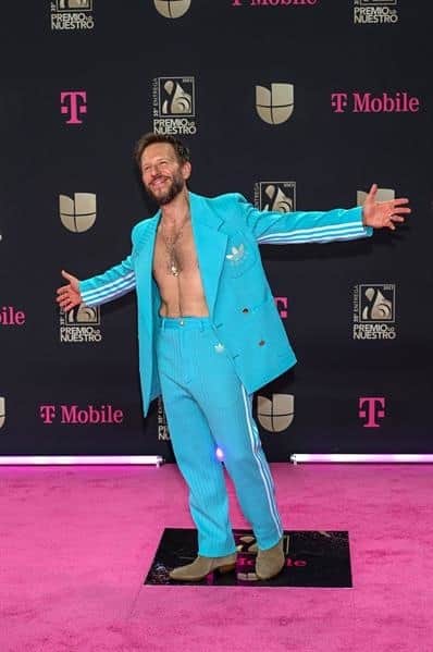 En la misma onda, a pesar de que su principal expresión es la balada, estaba el cantautor Noel Schajris, mejor conocido por ser miembro de Sin Bandera. El argentino vistió con un traje azul agua, sin camisa y con cadenas.