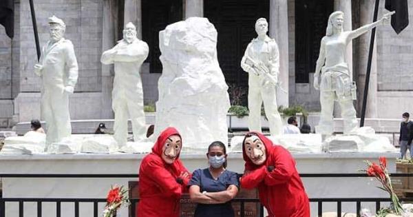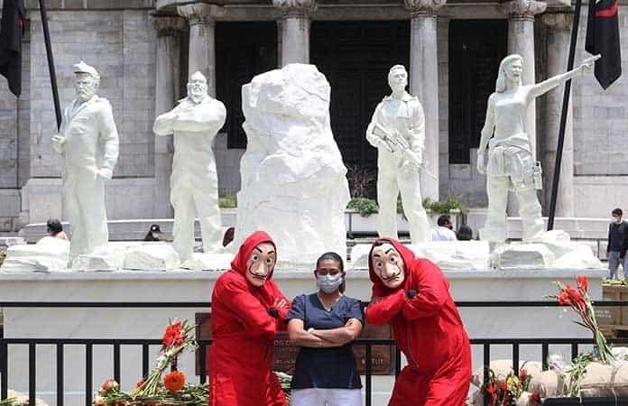 Dejando de lado la pandemia, los fans de la serie "La casa de papel" se formaron una y otra vez para tomarse una fotografía junto a la enorme escultura instalada afuera del Palacio de Bellas Artes en honor a los caídos de la serie, que estrena hoy su quinta temporada.