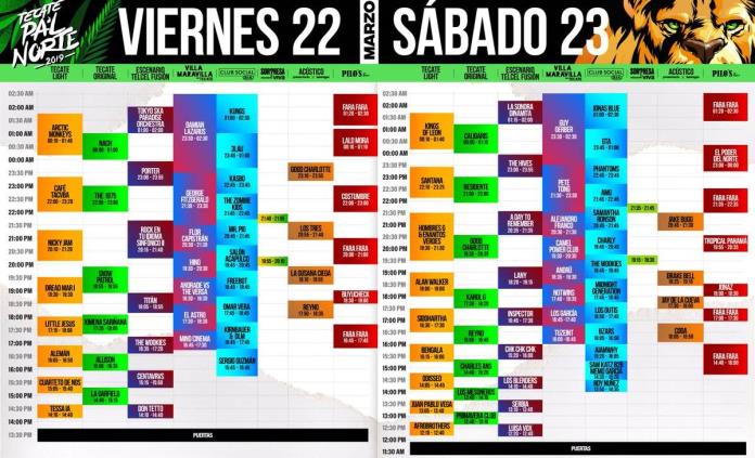En el foro Tecate Original abrirá La Garfield a partir de las 14:48 horas, seguido de Allison, Ximena Sariñana, Snow PAtrol, The 1975 y Nach; mientras que en el Escenario Telcel Fusion el espectáculo comenzará a partir de las 14:00 horas con Don Teto y continuarán Centavrvs, The Wookies, Titán, Rock en tu idioma sinfónico II, Porter y Tokio Ska Paradice Orchestra.