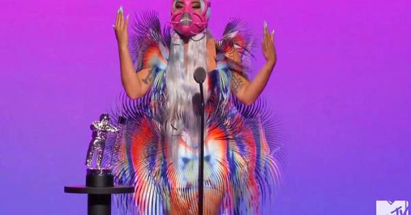 Gaga lució un tapabocas rosado amarrado alrededor de la cabeza, uno con colmillos puntiagudos e incluso uno con pantalla electrónica mientras cantaba "Rain on Me" con Grande, que también usó una mascarilla negra. Gaga recibió el premio a la artista del año en un abrigo de tul y organdí de Valentino y una mascarilla plateada que le hacía juego.