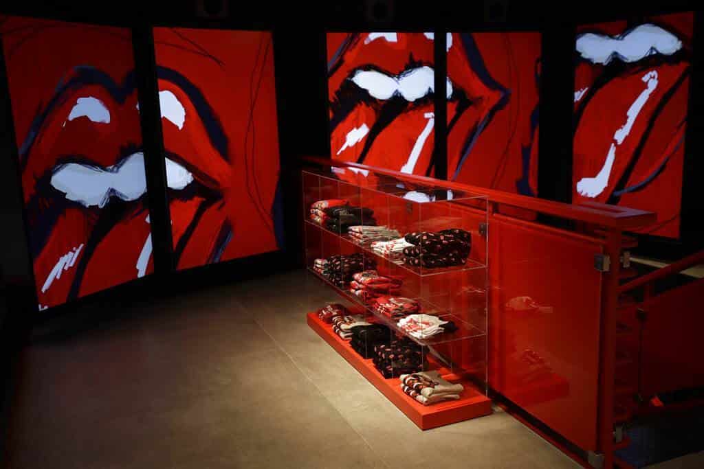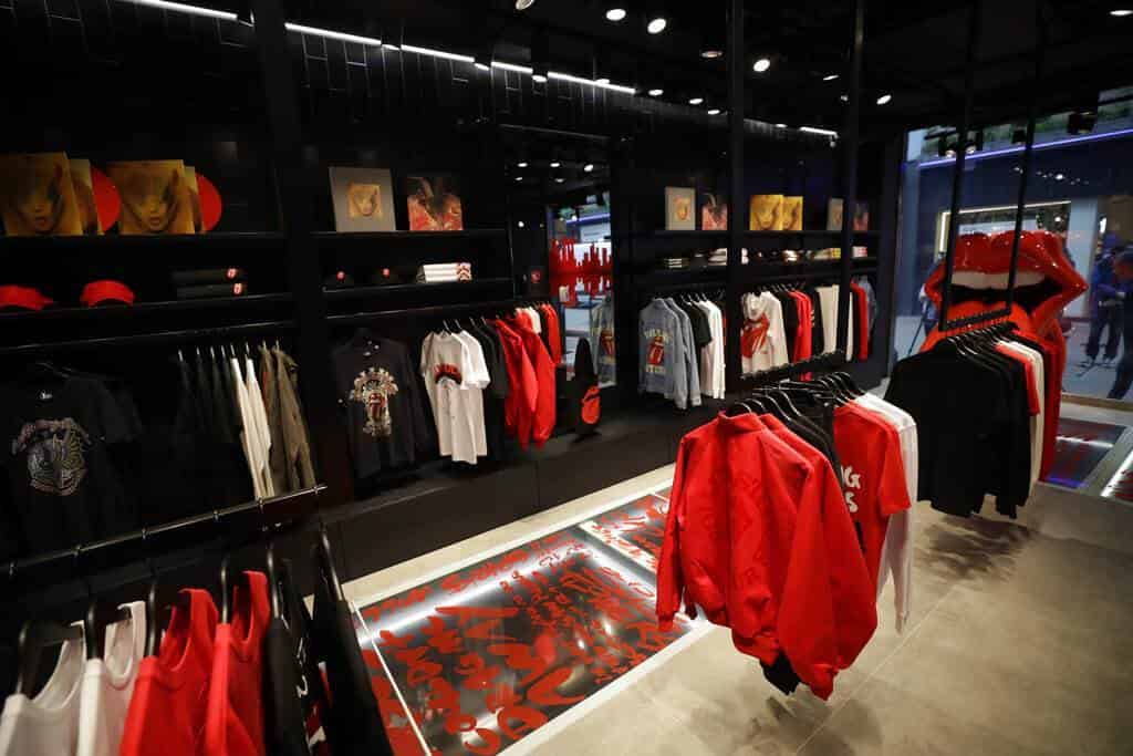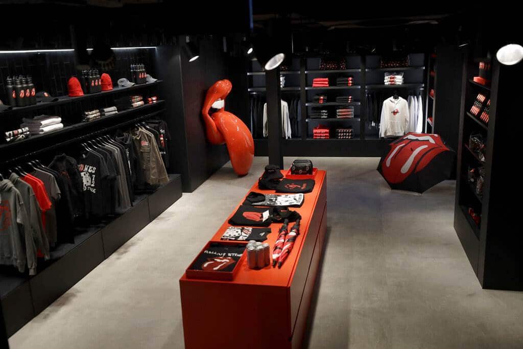 El mobiliario ha sido diseñado respetando el espíritu y los gustos de la banda al dominar el rojo y el negro, mientras que en los probadores se pueden ver en las paredes imágenes relacionadas con los álbumes creados durante casi sesenta años de carrera.