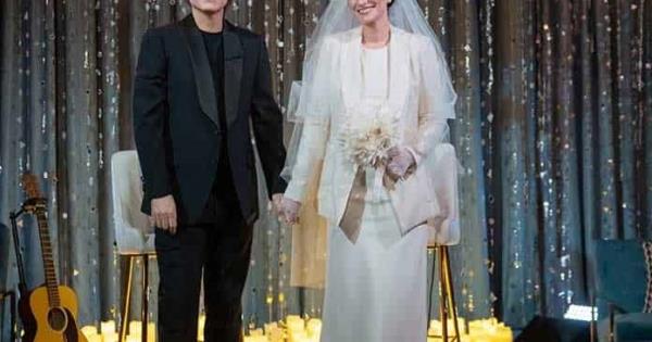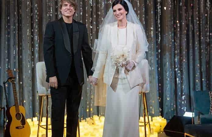 Pausini aparece sonriente con un vestido de raso blanco hasta los pies y una chaqueta americana del mismo color, con un velo de gasa y con un ramo de flores en la mano izquierda mientras con la otra sostiene la de su ya marido, completamente de negro.