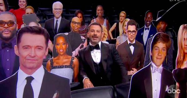 El anfitrión Jimmy Kimmel inauguró la ceremonia con un monólogo ante lo que parecía ser un teatro lleno de celebridades que lo vitoreaban, pero pronto reveló que esas eran imágenes de ceremonias pasadas de los Emmy.