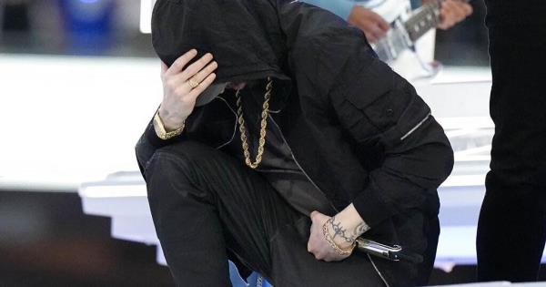 50 Cent tuvo una entrada sorprendente colgado de cabeza en el medio tiempo del Super Bowl y Eminem se arrodilló dramáticamente.