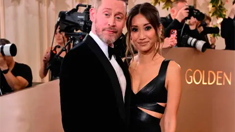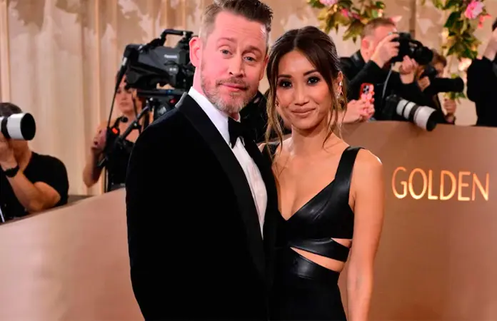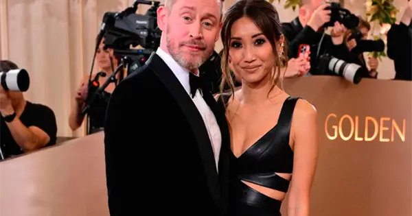 Acompañado de su esposa Brenda Song, Culkin deslumbra en la alfombra roja de los Globos de Oro, marcando su regreso triunfal a la ceremonia.