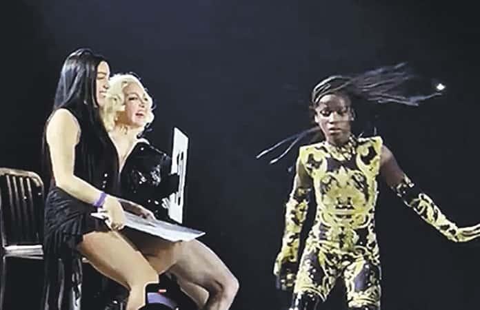 Sin duda, uno de los instantes más icónicos de la noche ocurrió cuando Madonna compartió con dos de sus hijas un momento sobre el escenario. Se trató del tema “Vogue”, cuando Lola León la acompañó a “calificar” a los bailarines de este género, entre los que se encontraba otras de sus hijas, Mercy, quien no dudó en plasmar sus mejores pasos sobre el escenario, por lo que Lola y Madonna alzaron carteles con el número “10”.
