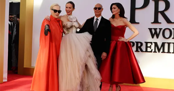 Blunt, de 43, la asistente veterana de la directora, llevó un vestido en color claro y de aire romántico, con cascadas de tul superpuestas, mientras que Tucci, de 65, el director de moda que mentoriza a Sachs, llevó un traje clásico oscuro, con chaqueta de terciopelo.