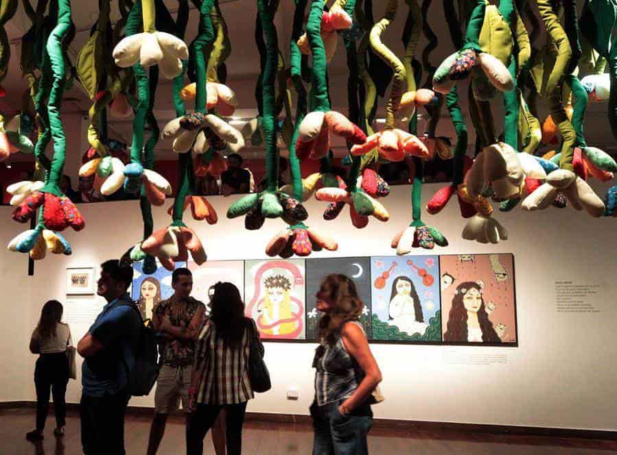 Igualmente muestra algunos de sus vestidos más icónicos, cuadros pintados por la artista en óleo, dibujos a tinta, tres grandes monstruos de trapo y un bosque colorista colgado del techo en el que se deslizan como una lluvia de susurros frases grabadas por la propia autora que envuelven al espectador en un entorno mágico.