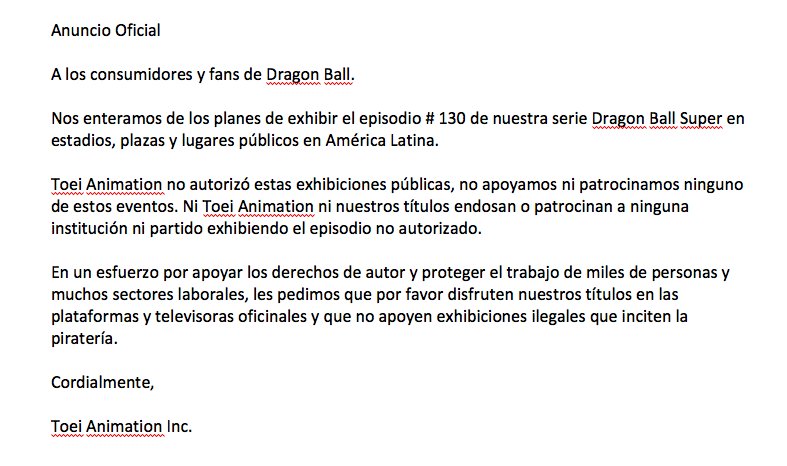 La casa de animación japonesa Toei Animation advirtió que no está autorizada la proyección pública de lo capítulos finales de Dragon Ball Super.