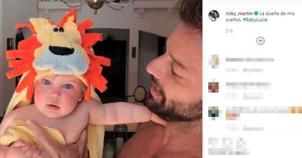 En la imagen el intérprete de temas como La vida loca, María y La copa de la vida sostiene a la bebé de ojos azules, envuelta en una toalla amarilla con un gorro de león.