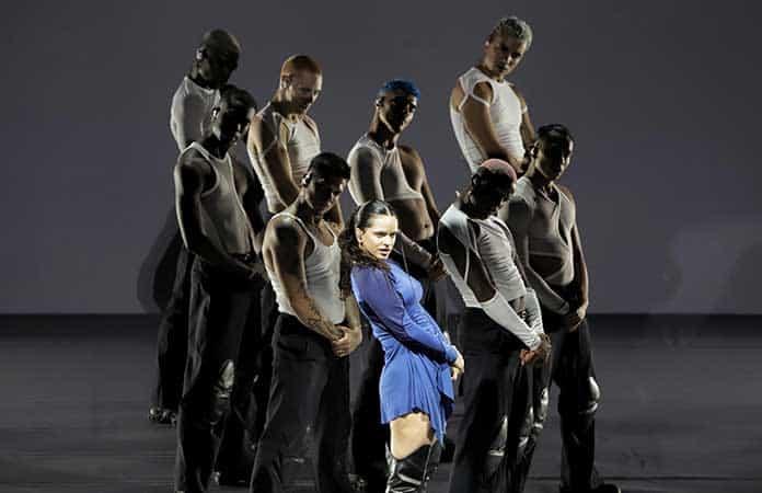 Precisamente para esa canción no sólo la española interactúa con el público preguntándole qué debe decir si ella dice Moto, sino que luego se trepa precisamente a uno de esos vehículos que sus bailarines han conformado con sus propios cuerpos entrelazados.