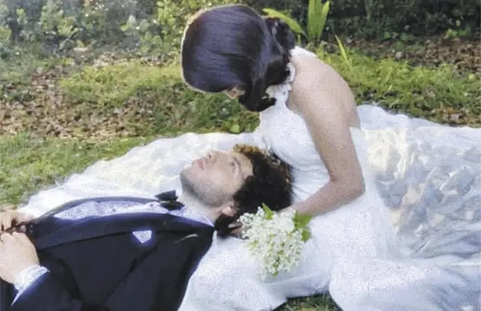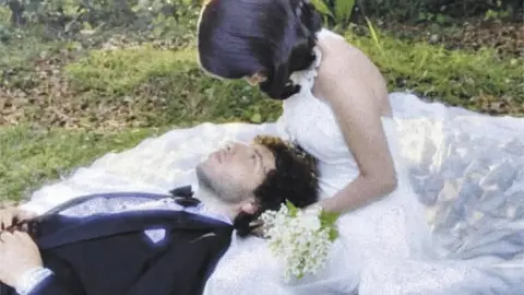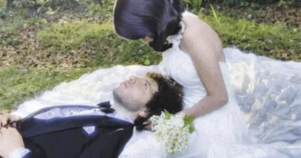 Las imágenes destacan algunos detalles de su vestuario: el vestido ceñido de Selena con pliegues en el pecho y flores tridimensionales, sus anillos de compromiso, y el clásico smoking negro de Blanco, cuyo moño Selena finge ajustar en las postales.
