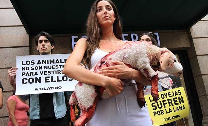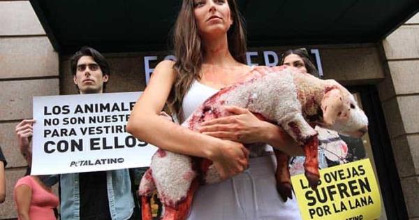 Vestida de blanco y acompañada por integrantes de PETA Latino y Animal Héroes, la joven de 29 años hacía un llamado a tomar conciencia. Cargaba una oveja de trapo con machas de color rojo para ejemplificar la manera en que se rapa su piel y sin cuidado para obtener la lana. “Se les mutila con heridas que quedan totalmente expuestas y sufren”.
