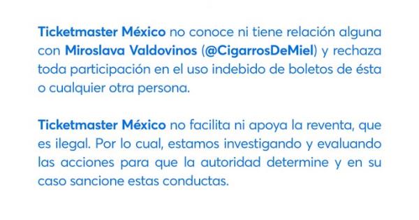 "Ticketmaster México no facilita ni apoya la reventa, que es ilegal. Por lo cual estamos investigando y evaluando las acciones para que la autoridad determine y en su caso sancione estas conductas".