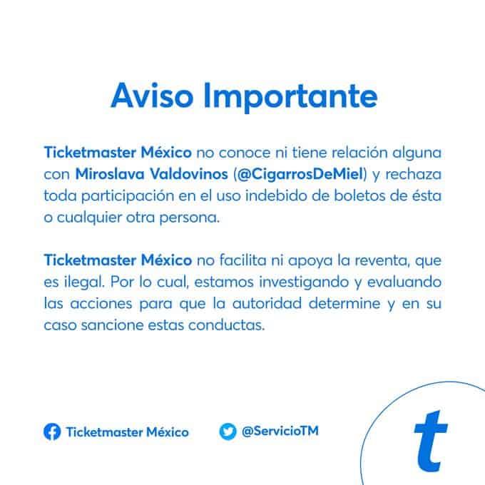 Ante los reclamos por parte de internautas hacia Ticketmaster, la empresa se deslinda de no conocer ni tener relación con Miroslava Valdominos y rechazó toda participación en el uso indebido de boletos de cualquier persona.