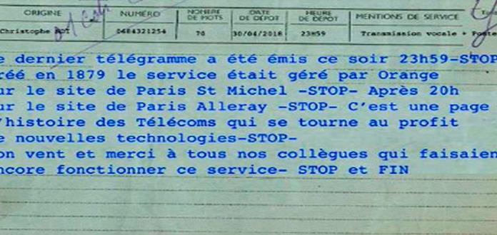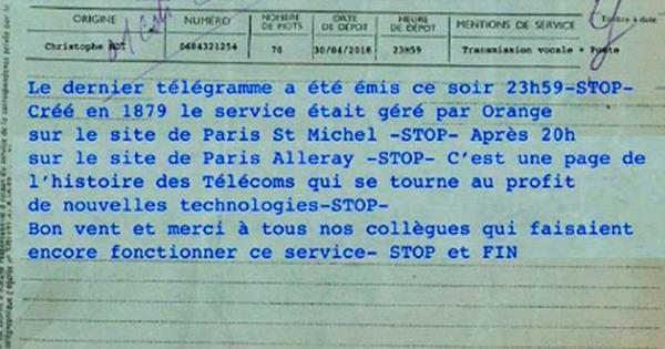 PARÍS (EFE).- El último telegrama de Francia fue enviado este lunes por la noche, según informó hoy el operador de telecomunicaciones Orange, encargada de este servicio que existía en Francia desde 1879.