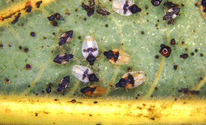 La chinche de encaje del aguacatero se alimenta sobre las hojas extrayendo nutrientes y destruye gradualmente las plantas, dijeron los expertos. La chinche no se alimenta del aguacate en sí.