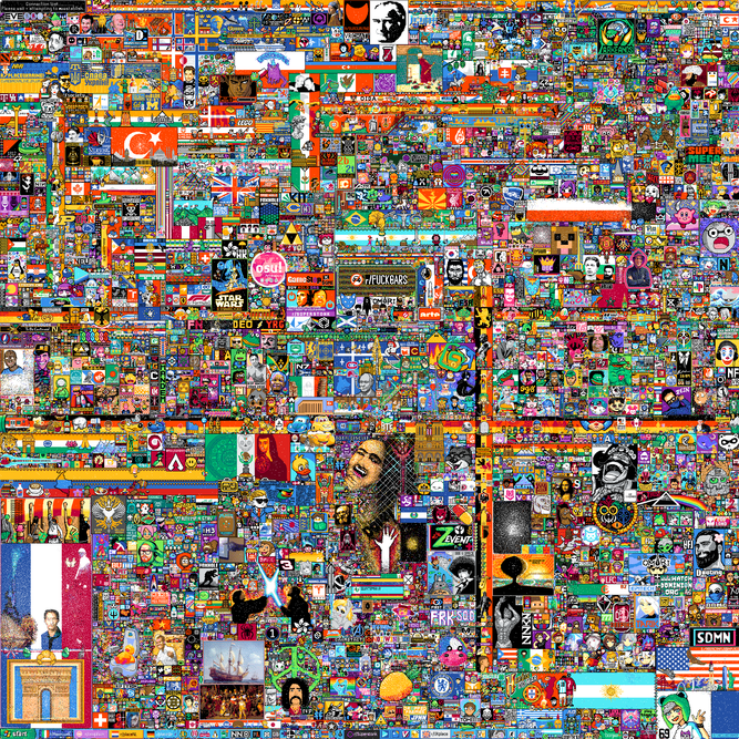Reddit, uno de los portales más famosos del mundo, organiza cada año un gigantesco lienzo en el que todos sus usuarios puedan participar. La idea base es bastante simple, solamente se pide que los participantes creen imágenes utilizando píxeles. Para ello, cada usuario está puede aportar un píxel cada cinco minutos.