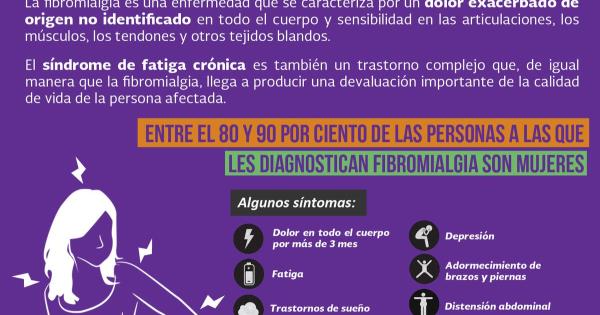 Dolor en el cuerpo por más de tres meses, fatiga, trastornos del sueño, dolor de cabeza, cólicos, depresión, adormecimiento de brazos y piernas, así como distensión abdominal y ansiedad son síntomas de fibromialgia, enfermedad que padecen principalmente las mujeres, informó el Instituto Mexicano del Seguro Social (IMSS).