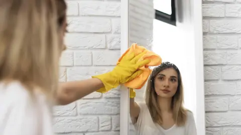 Si el espejo tiene salpicaduras de pasta dental o maquillaje, retíralas antes con un poco de vinagre y una esponja suave.