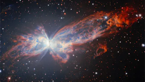 La Nebulosa de la Mariposa se encuentra a entre 2.500 y 3.800 años luz de distancia, en la constelación de Escorpio. Un solo año luz equivale a unos 9 billones de kilómetros (6 billones de millas). La imagen fue tomada el mes pasado por el telescopio Gemini Sur.