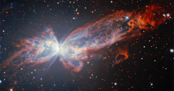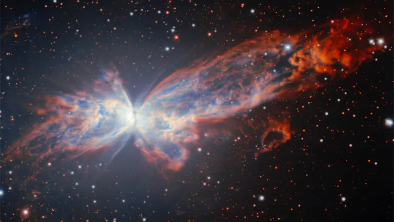En el corazón de esta nebulosa bipolar se encuentra una estrella enana blanca que hace mucho tiempo desechó sus capas exteriores de gas. El gas descartado forma las alas similares a las de una mariposa que se despliegan desde la estrella envejecida, cuyo calor hace que el gas brille.