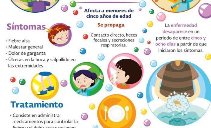 Fiebre alta, dolor de garganta, úlceras en la boca y salpullido en las extremidades, son algunos de los síntomas del virus de Coxsackie, conocido como enfermedad de manos, pies y boca, que afecta a menores de 5 años, alertó la Secretaría de Salud.