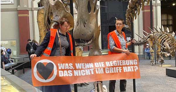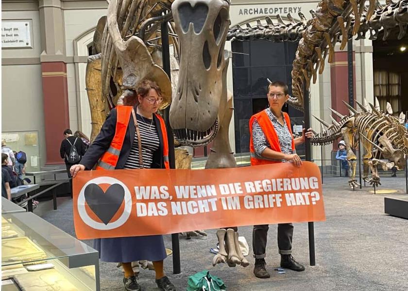 Dos ambientalistas se adhirieron con pegamento a una exhibición de dinosaurios en el Museo de Historia Natural de Berlín el domingo, para protestar lo que dicen es la falta de acción del gobierno alemán para encarar la crisis climática.