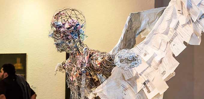 “Santa conte” de Manuel González Torres, una escultura de un ángel alado realizado con ensamble de papel y alambre, en el interior de la estructura el autor insertó billetes falsos. Carlos Martínez presenta pintura, como su “Autorretrato” realizado con óleo en aerosol sobre lienzo y pincel de cerda.