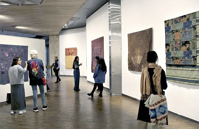 La muestra presenta tapices y esculturas blandas que integran costuras y elementos orgánicos, con los que la artista construye formas que remiten a símbolos antiguos. Algunas piezas incorporan plumas de guacamaya y objetos tradicionales, lo que amplía las posibilidades materiales del textil y su relación con otras expresiones culturales.
