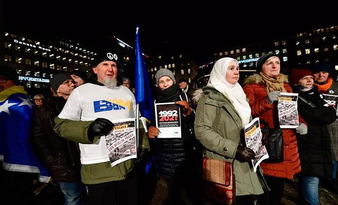 En una noche de temperaturas bajo cero, se leían pancartas que decían "Negar el genocidio es la fase final del genocidio", "De quién te fías de Handke o de la Haya" en referencia al Tribunal Penal para la Antigua Yugoslavia.