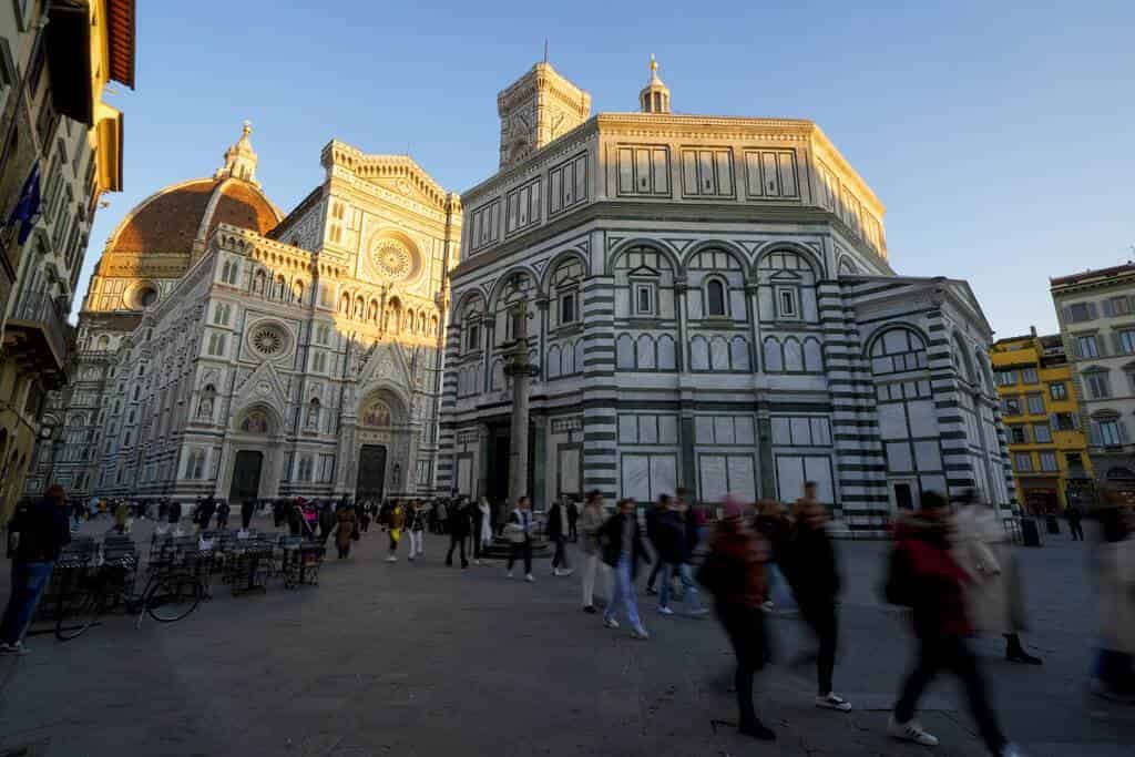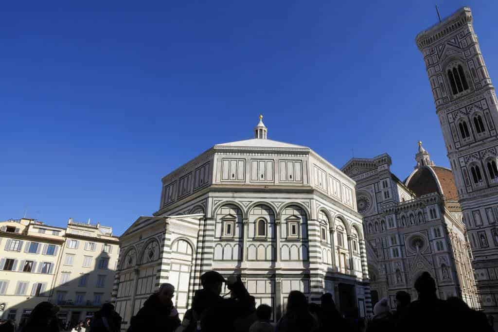 Pese a su inabarcable historia, sigue asombrando por su belleza, con un exterior revestido de mármoles blancos y verdes y custodiado por tres impresionantes puertas de bronce, una de ellas la famosa del Paraíso, de Lorenzo Ghiberti, cambiadas eso sí por réplicas desde 1966 para evitar el -imperdonable- deterioro de las originales.