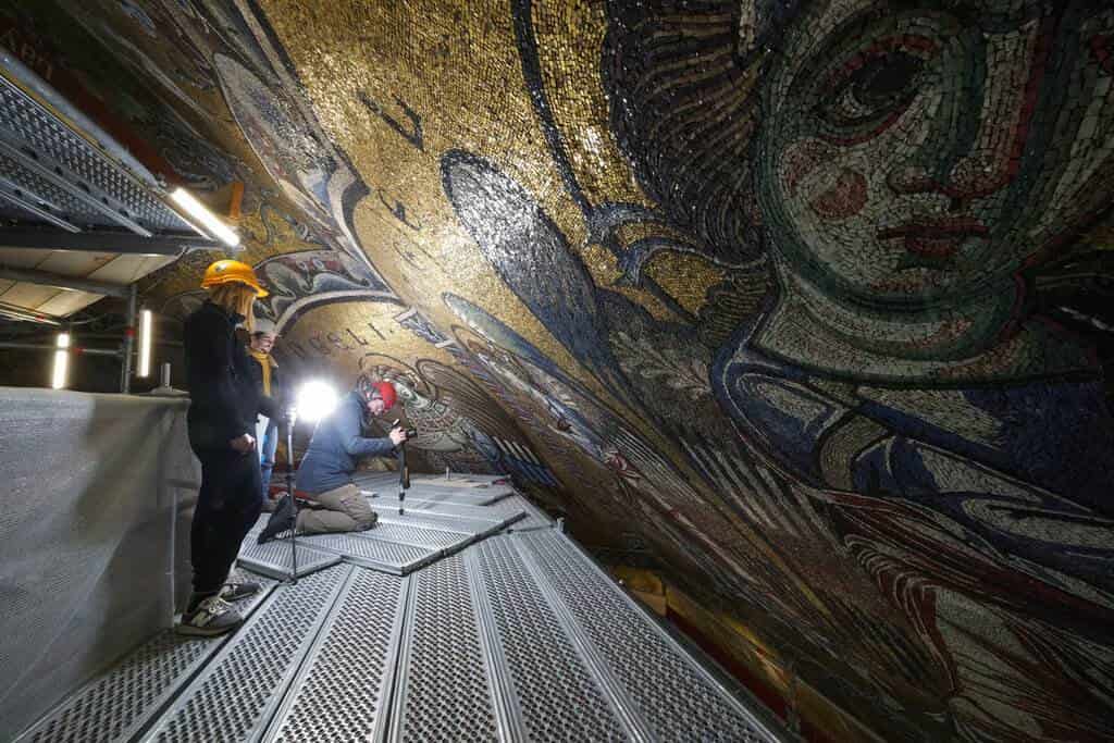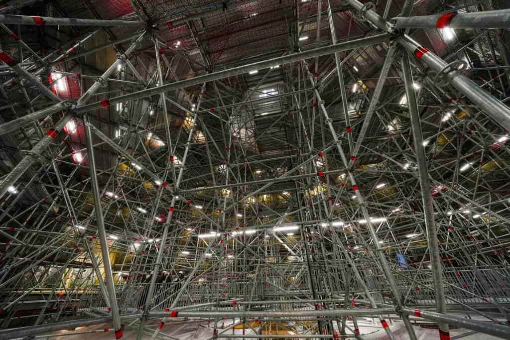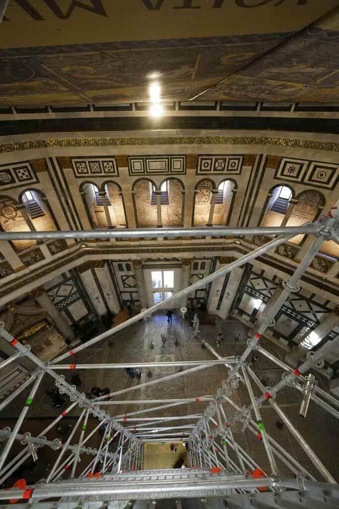 Para ello se ha construido un andamio impresionante con forma de seta: ha sido ensamblado al suelo del baptisterio ocupando lo mínimo posible para permitir el culto, solo en 63 m², y al llegar a la base de la cúpula, a 31,5 metros de altura, despliega una plataforma de 618 m² de varios pisos que permitirá alcanzar todos los mosaicos.