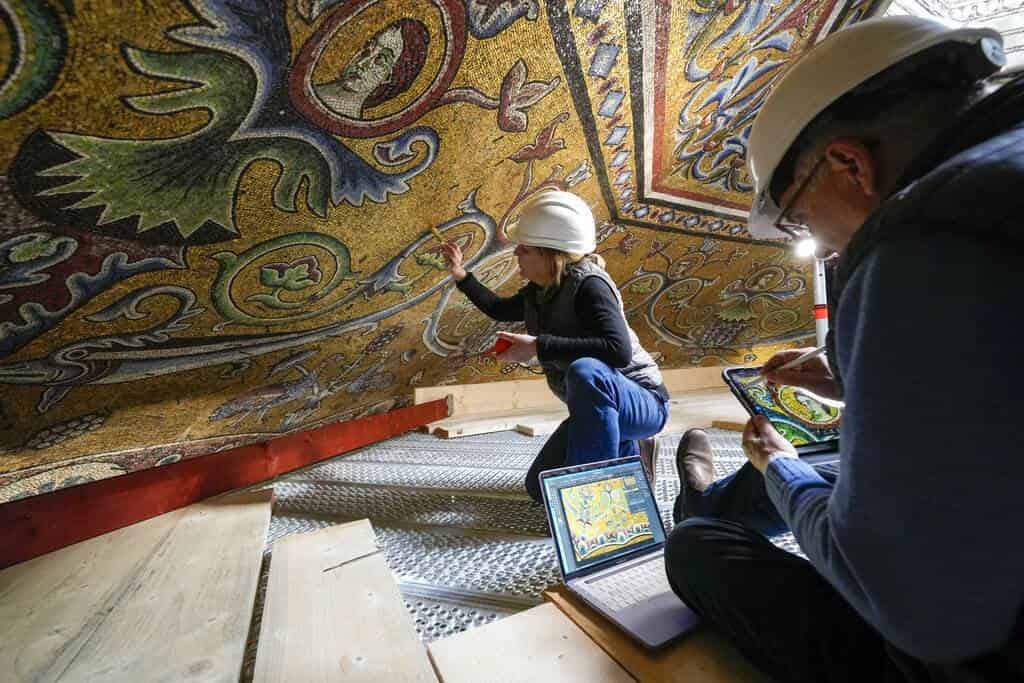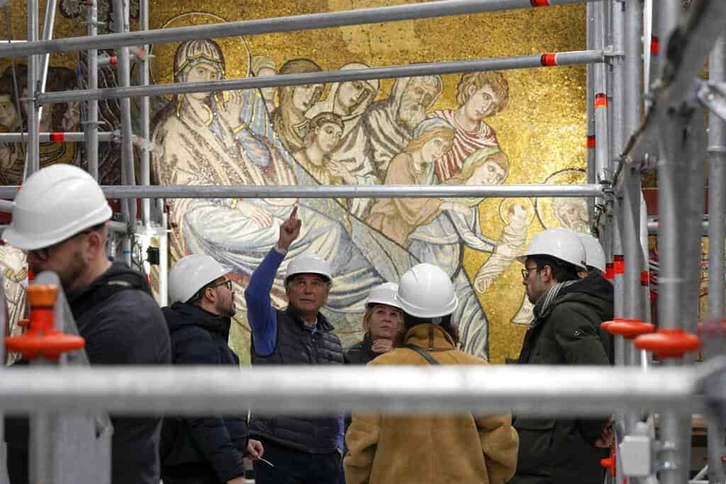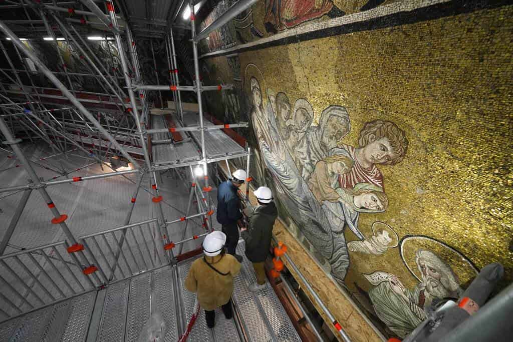 Este curioso andamio permitirá a estudiosos, turistas o curiosos subir a la cúpula ya desde finales de este mes -previa reserva- para apreciar al detalle la puesta a punto de uno de los ciclos de mosaicos más importantes de la historia del arte, avanza Caciagli.