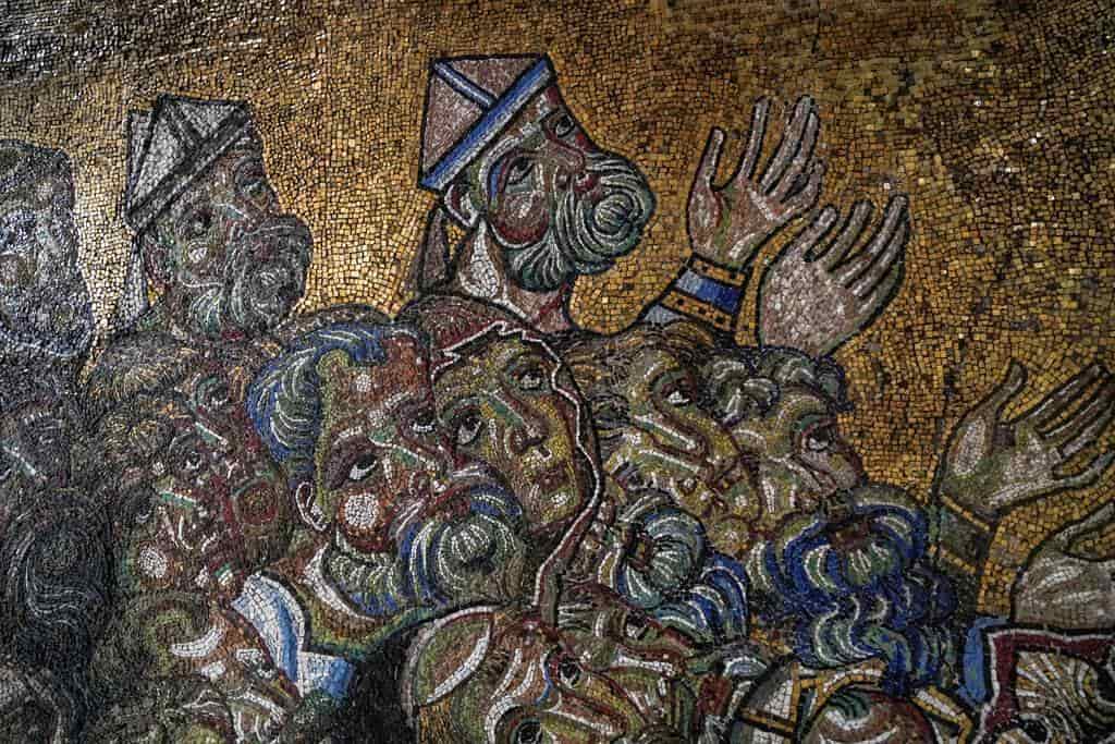 En su interior, aparece un espacio de planta octogonal con un sencillo altar, pero basta mirar a las alturas para asombrarse con los gigantescos mosaicos dorados y policromos que decoran su cúpula, los más antiguos incrustados allá por el año 1225.