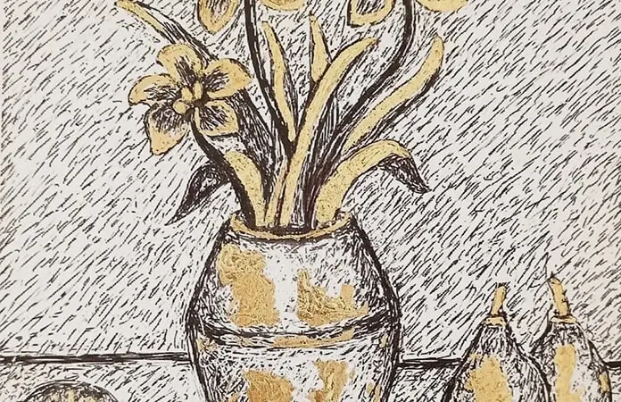 La exposición reúne una selección de dibujos que muestran el interés de Escorcia por el detalle, la composición y el manejo de la línea. Su trabajo combina técnicas tradicionales con herramientas digitales, incorporando elementos como la hoja de oro para ampliar el espectro visual de sus piezas. Esta práctica técnica convive con una serie de referentes simbólicos que atraviesan su obra, sin buscar una narrativa directa o ilustrativa.