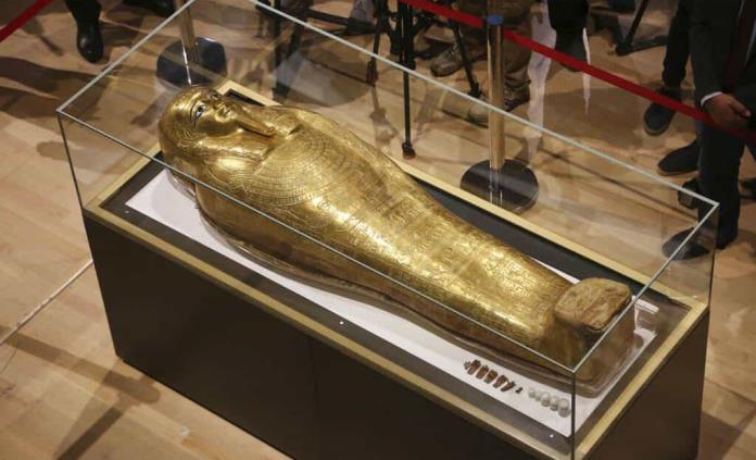 Egipto exhibió el martes un antiguo ataúd dorado del primer siglo previo a nuestra era, que el Museo Metropolitano de Arte de Nueva York devolvió la semana pasada después de que los investigadores estadounidenses determinaron que era una antigüedad saqueada.
