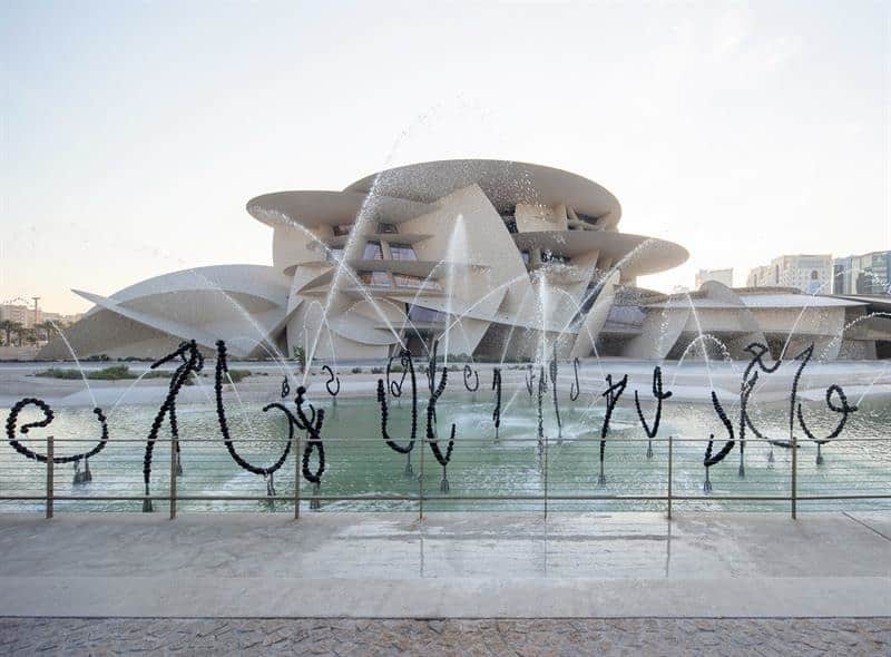La espectacular entrada recibe a los visitantes con 114 esculturas y fuentes en una laguna de 900 metros de largo, en un espacio en el que las curvas buscan ser “como las dunas del desierto”, según su autor, el arquitecto Jean Nouvel.